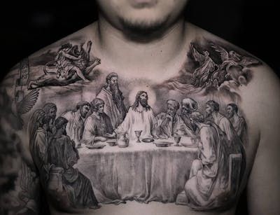 In conclusion, the Last Supper chest tattoo is a profound expression of faith and art. It combines deep religious symbolism with personal significance. Furthermore, this tattoo goes beyond mere decoration; it is a statement of belief, a piece of living art, carrying a timeless story on one’s skin.