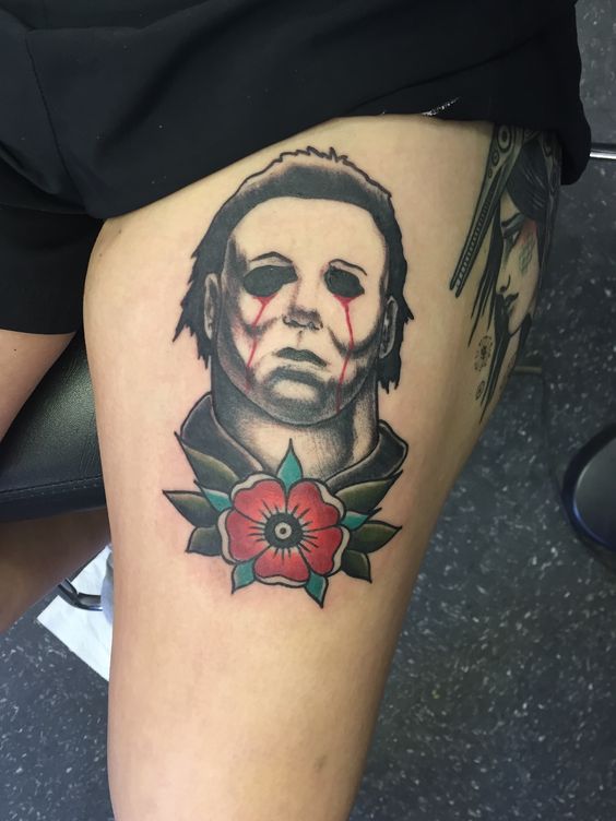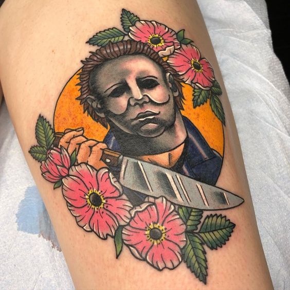 Additionally, a traditional Michael Myers tattoo can transform an arm, leg, or back into a canvas of macabre artistry. Similarly, the shadowy figures lurking on the skin reflect a deep appreciation for classic horror. These tattoos show a dedication to a genre that thrills and chills. Likewise, they whisper of Halloween nights, of the boogeyman that walks silently in the dark.