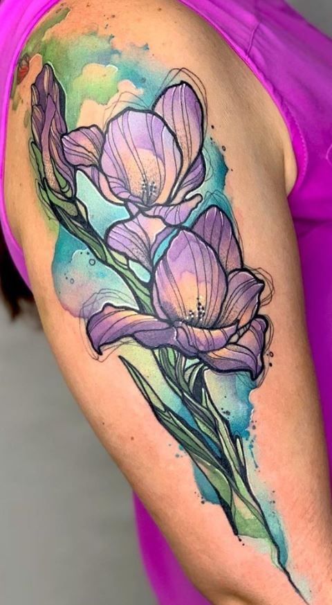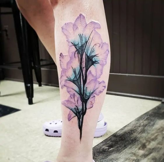 Artists specializing in watercolor tattoos excel in creating these designs. They skillfully blend colors to mimic the natural gradients found in real gladiolus flowers. The result is a tattoo that looks like a brush-stroked painting, with each petal and leaf vividly brought to life.