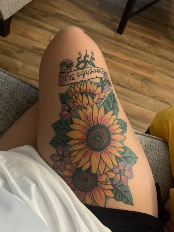 In conclusion, a sunflower thigh tattoo is a symbol of elegance and strength. It uniquely celebrates beauty and individuality. This tattoo choice can boost confidence and add a touch of glamour to your style. It’s not just a tattoo; it’s a personal manifesto of joy and resilience. Embrace the sunflower’s symbolism and make a powerful statement with your ink.