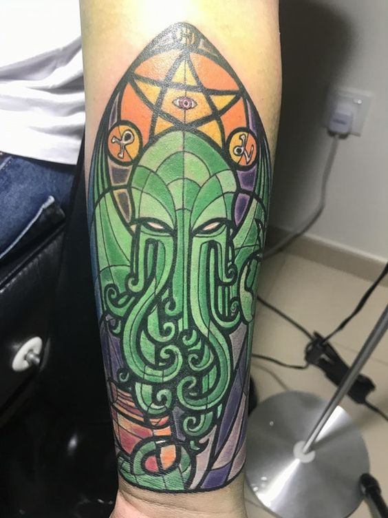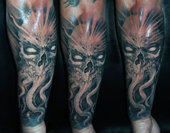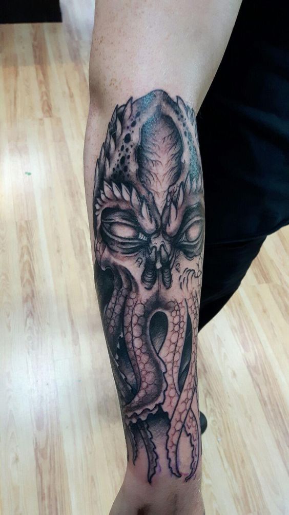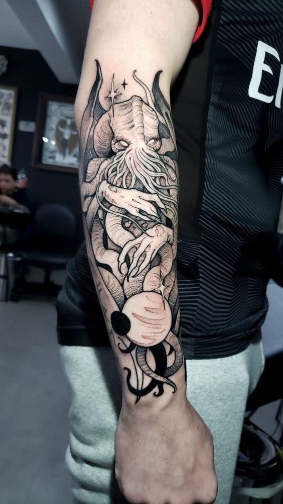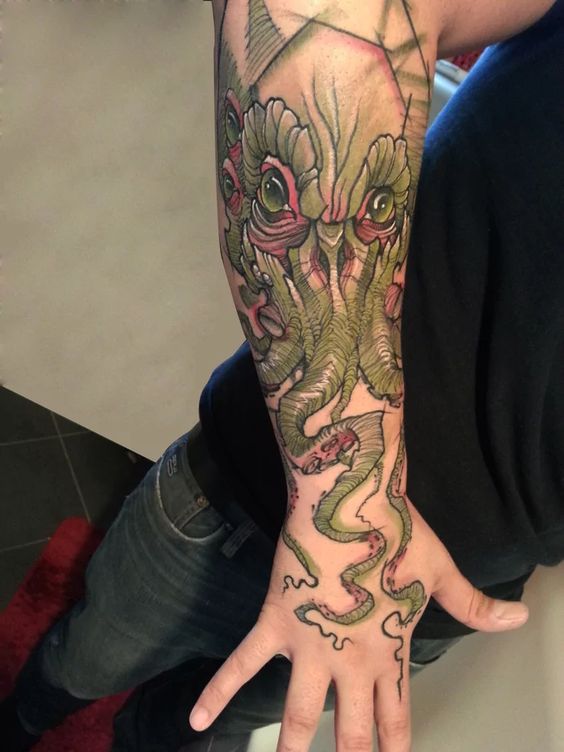 In conclusion, forearm Cthulhu tattoos are astounding works of art. They bridge the gap between the realms of fantasy and reality. These tattoos are not only a testament to the wearer’s imagination but also an homage to Lovecraft’s enduring legacy. In essence, they transform the forearm into a canvas of cosmic intrigue and awe-inspiring beauty.